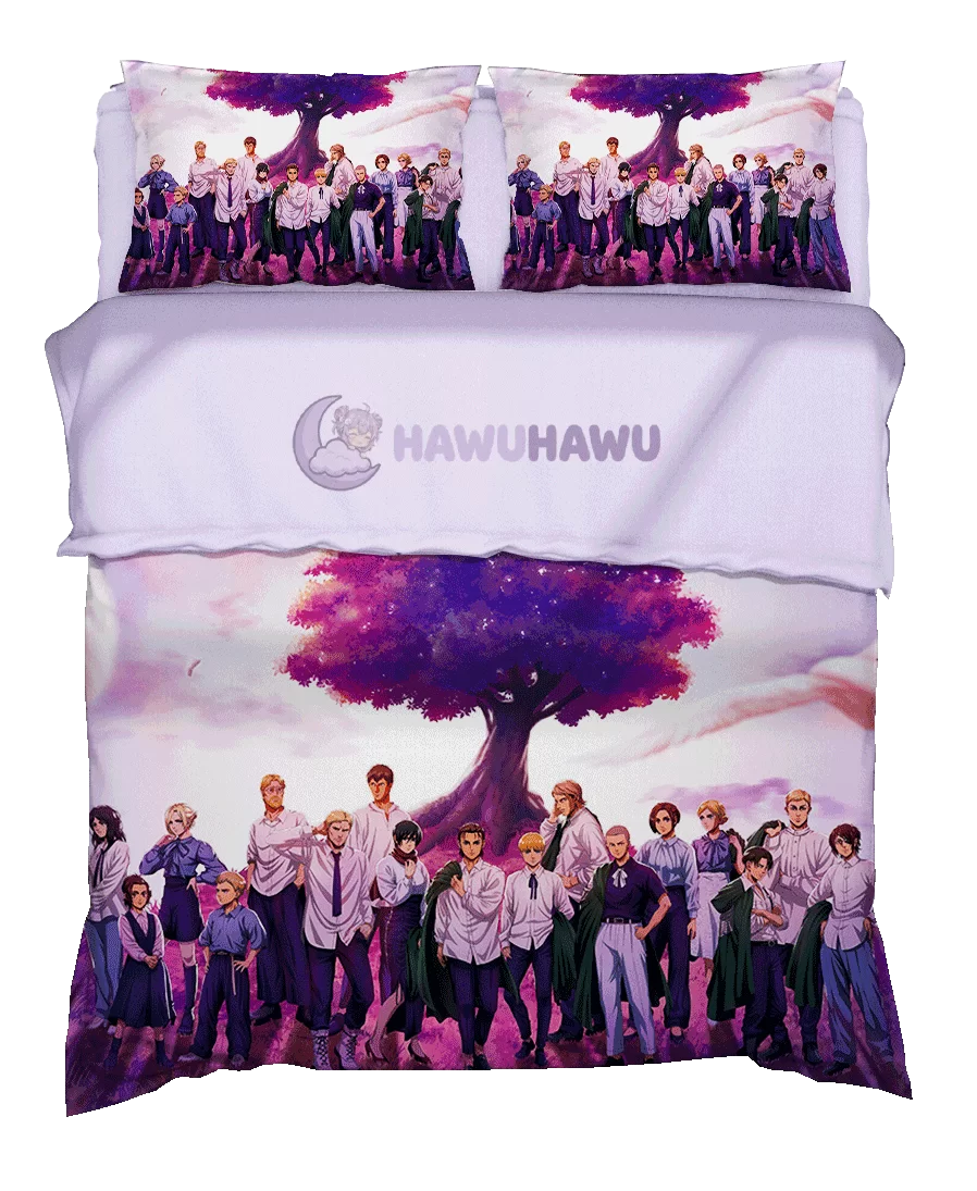 Transform your bedroom into a realm of adventure with our Attack on Titan Anime Bed Sheet Sets – Global Sizing Standard. Featuring a dynamic scene of numerous characters, both male and female, standing beneath a towering tree, this design captures the epic spirit of the beloved series. Crafted for fans who want to bring their favorite anime to life, these bed sheets blend vibrant imagery with superior comfort. Perfectly suited for anime enthusiasts, they turn any sleeping space into a battleground of imagination and heroism. Elevate your bedroom decor today with this stunning Attack on Titan-themed bedding set and sleep inspired by courage, friendship, and legendary battles.